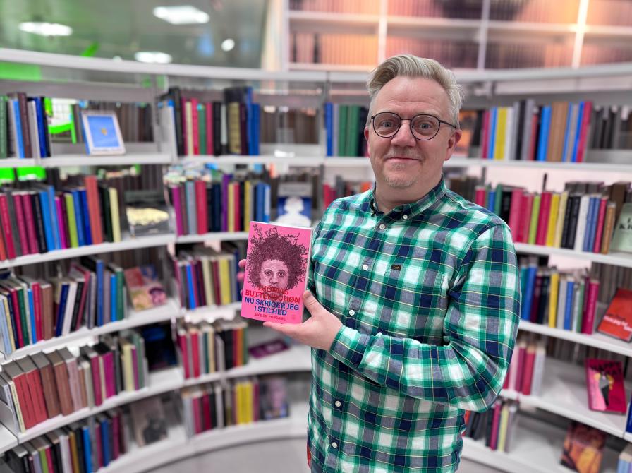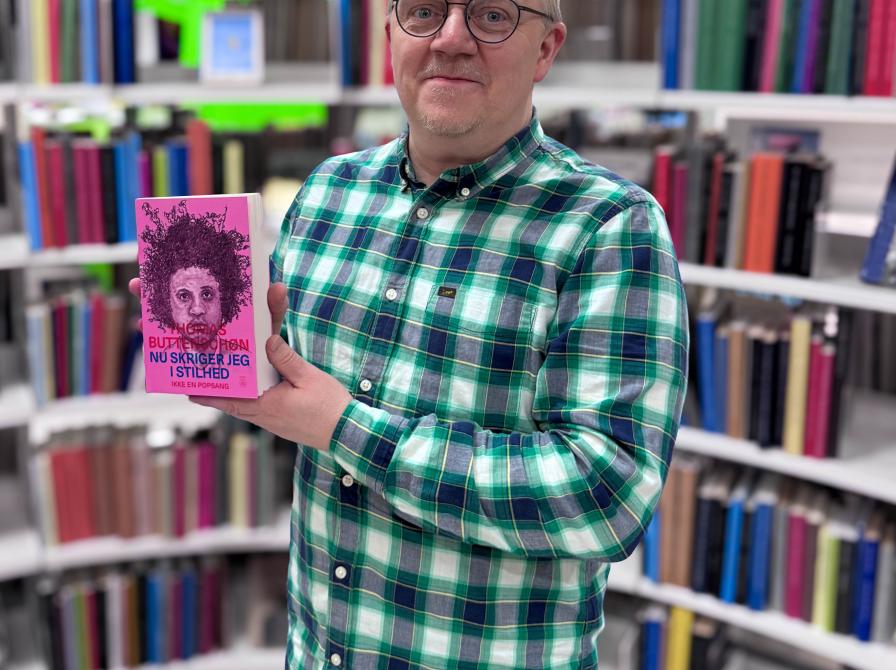 MODERATOR: Martin skal moderere samtalen med forfatter og sangskriver Thomas Buttenschøn den 11. april til Ordkraft. Her ses han i biblioteksrummet på Hjørring Bibliotek med bogen "Nu skriger jeg i stilhed" i hænderne.