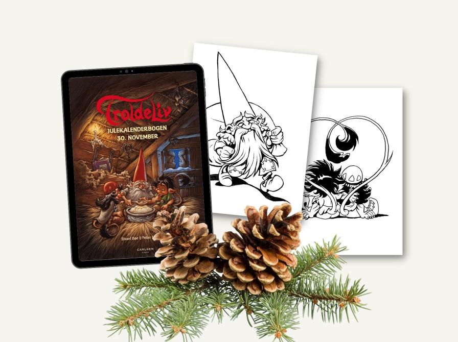 Herunder kan I finde farvelægningsark med Peter Madsens illustrationer fra Troldeliv, hvor hele troldefamilien og gårdnissen Nisse Nik kan printes. En idé er, at I klipper figurerne ud og lader dem flytte ind i jeres landskab fx ved at klistre tegningerne på kogler eller lime dem sammen med både en forside og en bagside og en lille papirfod, så de kan så selv. Så kan I lege videre med universet, selv når dagens afsnit fra julekalenderbogen er slut. I kan også printe dem i stor størrelse og bruge dem som malebog i stedet.